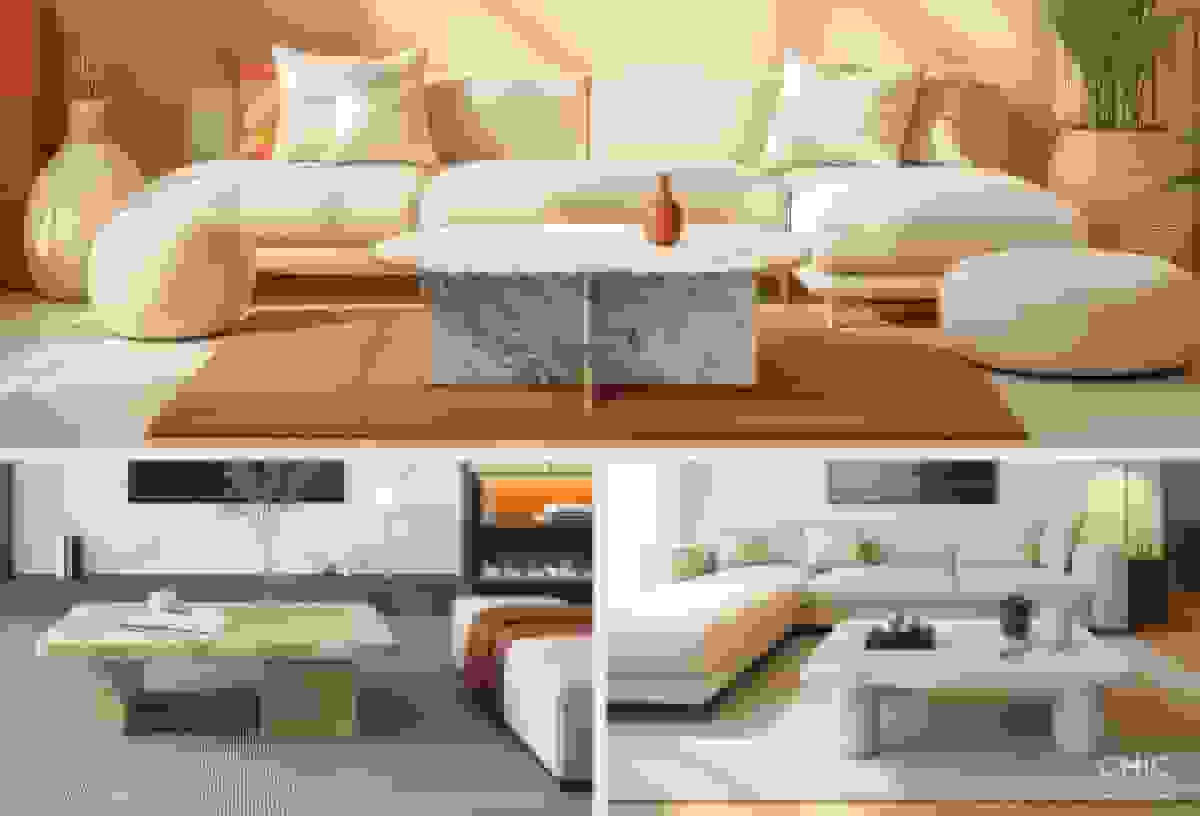 เปลี่ยนมุมบ้านให้หรูเหมือนโรงแรมด้วยไอเดียจัด เฟอร์นิเจอร์ห้องนั่งเล่น แบบ Material Mix ด้วยโซฟา โต๊ะกลาง และชั้นวางดีไซน์พรีเมียมจาก Chic Republic