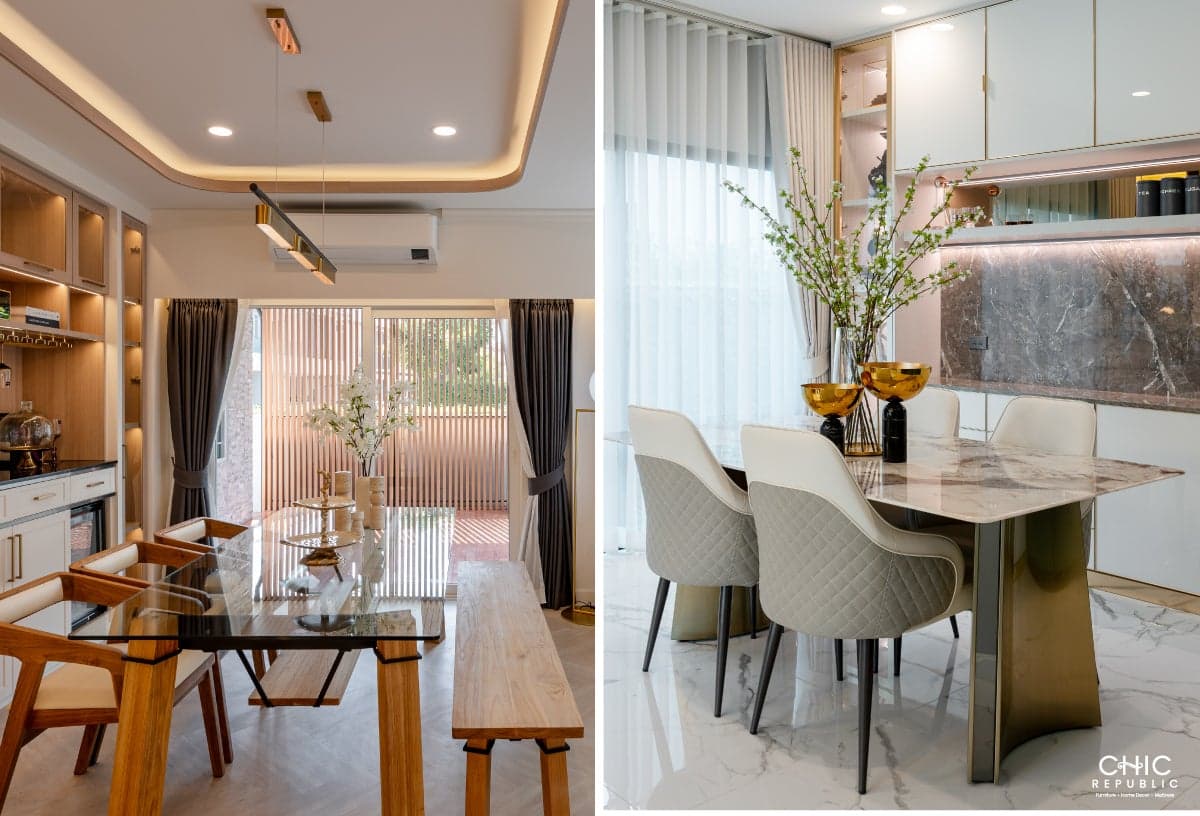 โต๊ะอาหารจะดูหรูอย่างสมบูรณ์ได้เมื่อทำงานร่วมกับองค์ประกอบอื่นรอบตัว โดยเฉพาะเก้าอี้และแสง หากเก้าอี้มีวัสดุหรือโทนสีที่ส่งเสริมกัน และมีแสงที่ช่วยขับ mood ของโต๊ะให้ดูโดดเด่นขึ้น พื้นที่รับประทานอาหารทั้งหมดก็จะดูมีเรื่องราวและมีความสมบูรณ์มากขึ้น